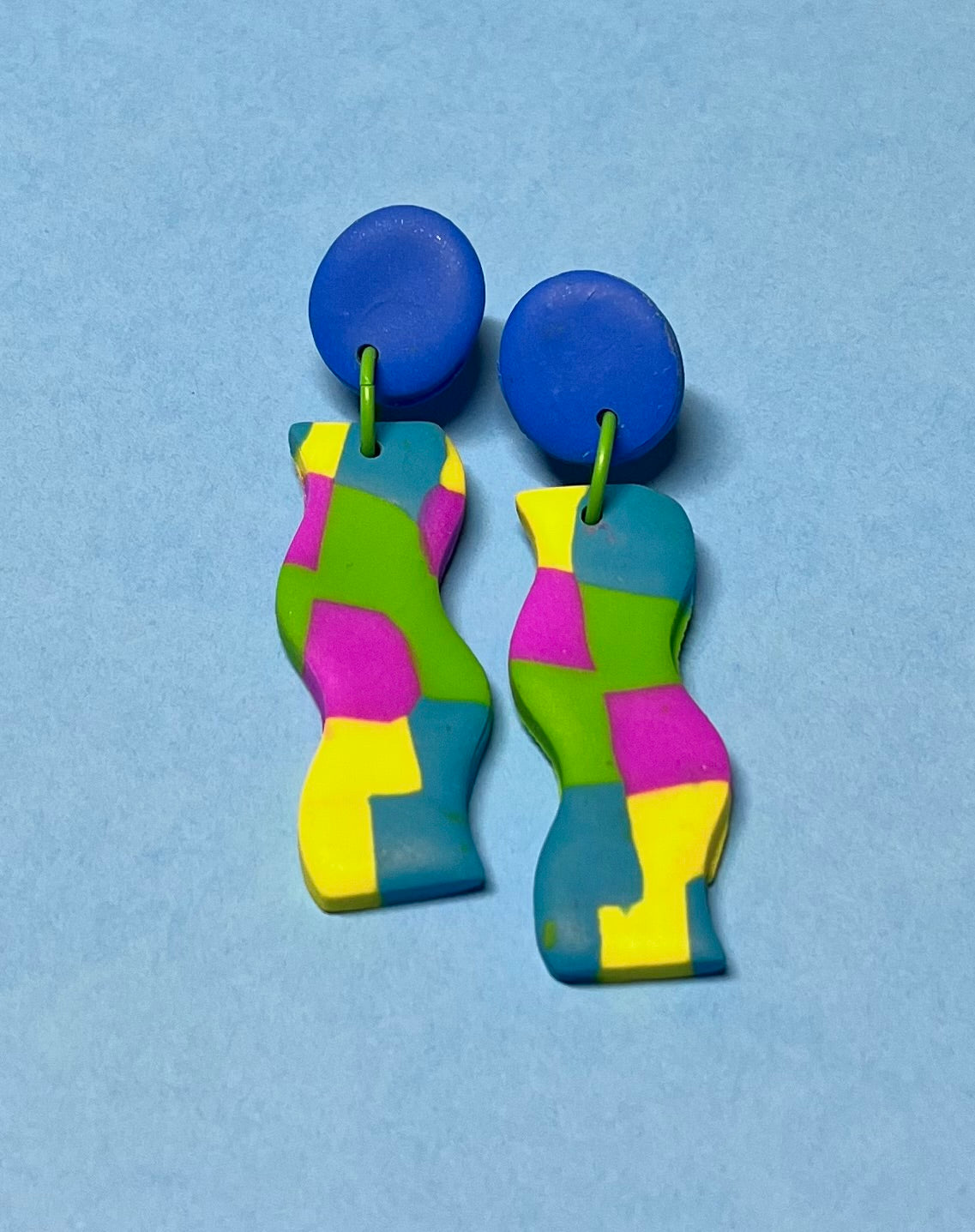 Nach dem kreativen Prozess wird das Material im Ofen gehärtet, geschliffen und anschließend zu einem Ohrring weiterverarbeitet. Polymer Clay eignet sich super für große Ohrringe, da es sehr leicht ist und so beim Tragen die Ohrläppchen nicht unnötig belastet.